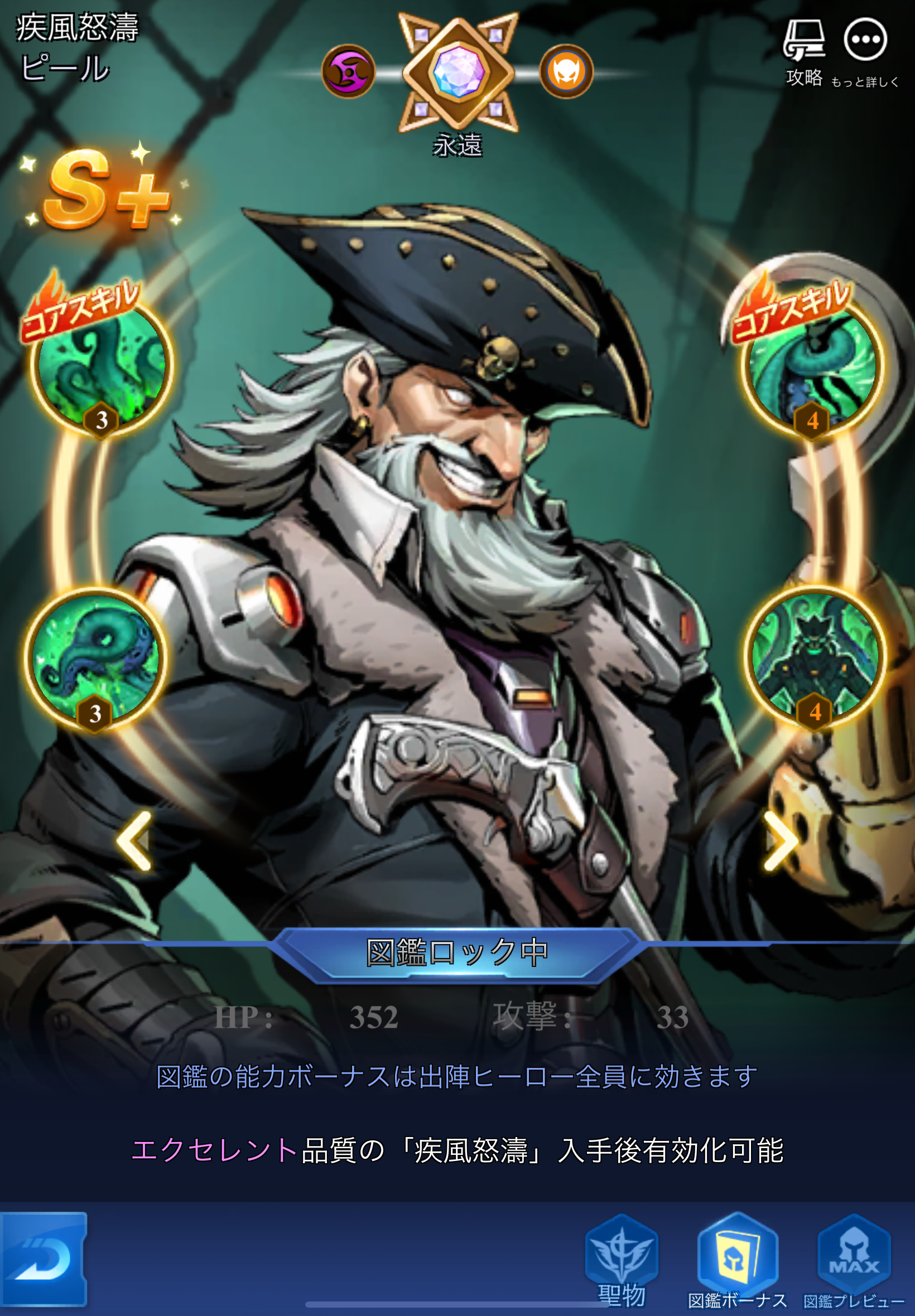 そうすると90回回した時点でS+キャラでガチャで手に入るキャラはすべて開放されるのですが、その中にピック船長もいます。